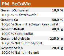 Natriumselenit (schnell wirksam), Co-EDTA (Kobaltsulfat, schnell wirksam), schnell wirkendem Natriummolybdat, Gips, Bindemittel